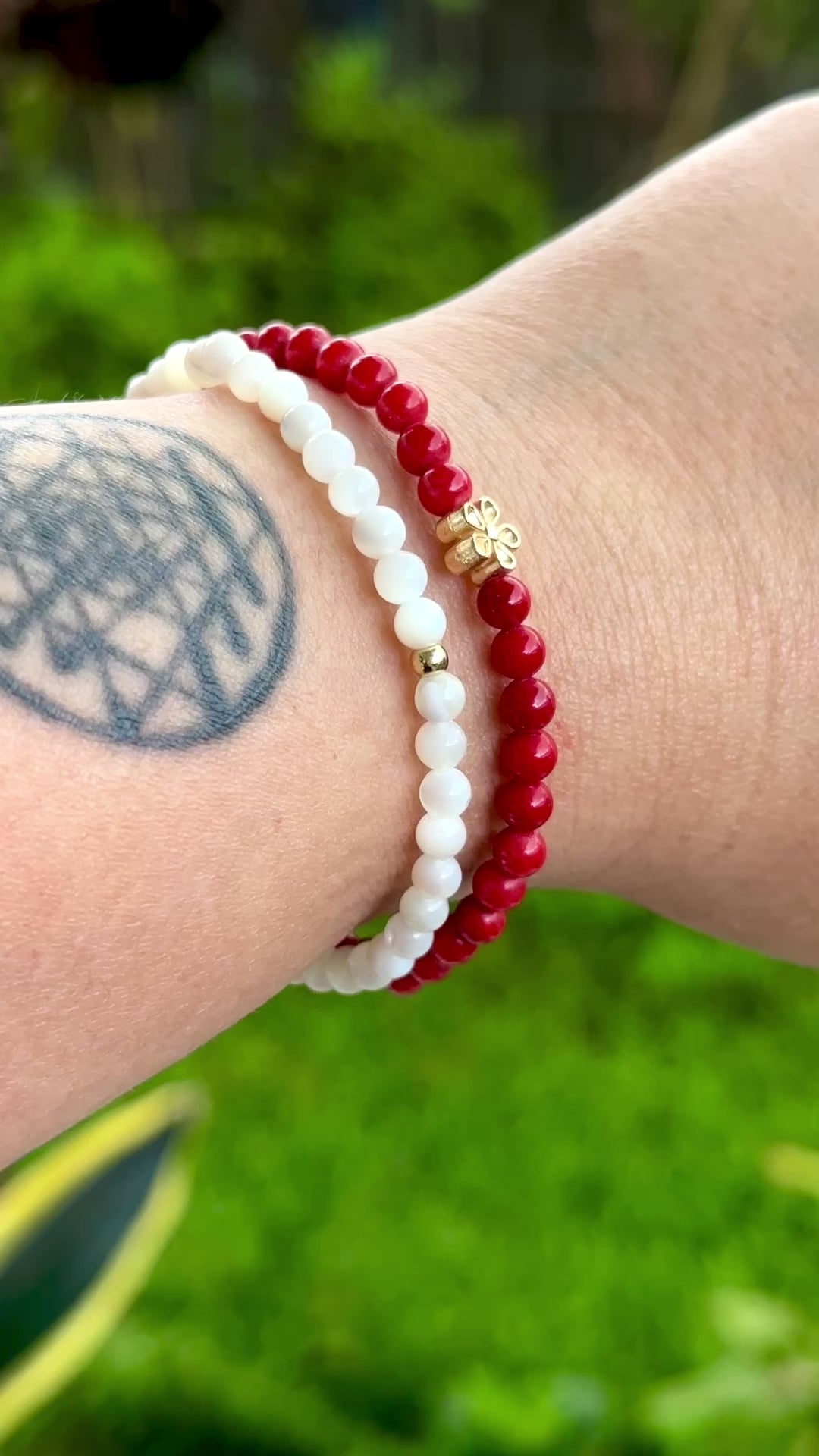 Energy Balance Infinity Bracelet (Red Coral (dyed) & Mother of Pearl 4mm with 14k gold plated copper charms)