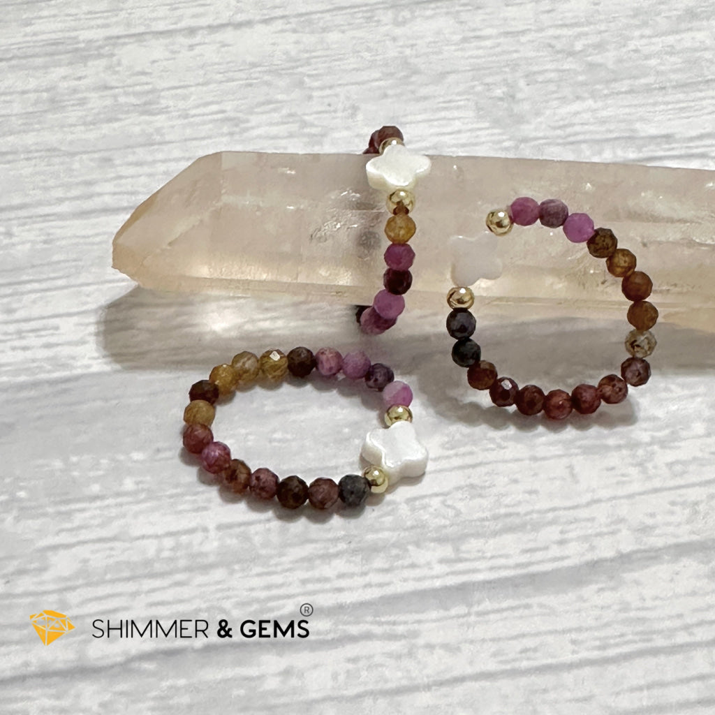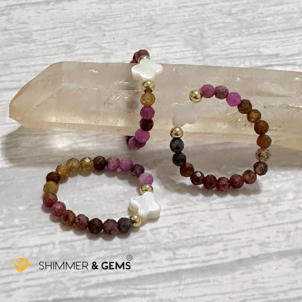 Mixed Sapphire Bead Ring 3mm with 14k gold filled & Mother of Pearl Clover (Blue, Green, Pink, Yellow and Red Sapphire)