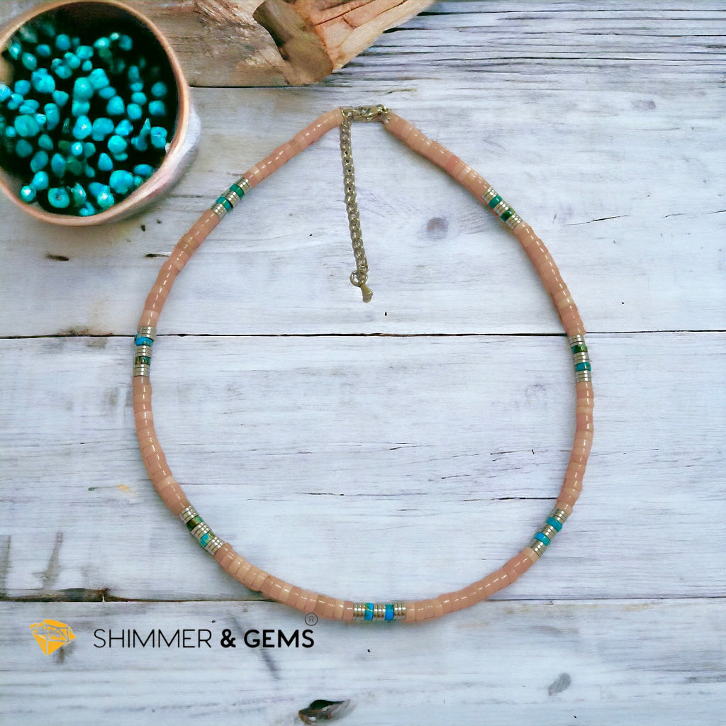 Pink Opal, Impression Jasper & Hematite Wheel Beads Necklace with Stainless Steel Beads & Clasp